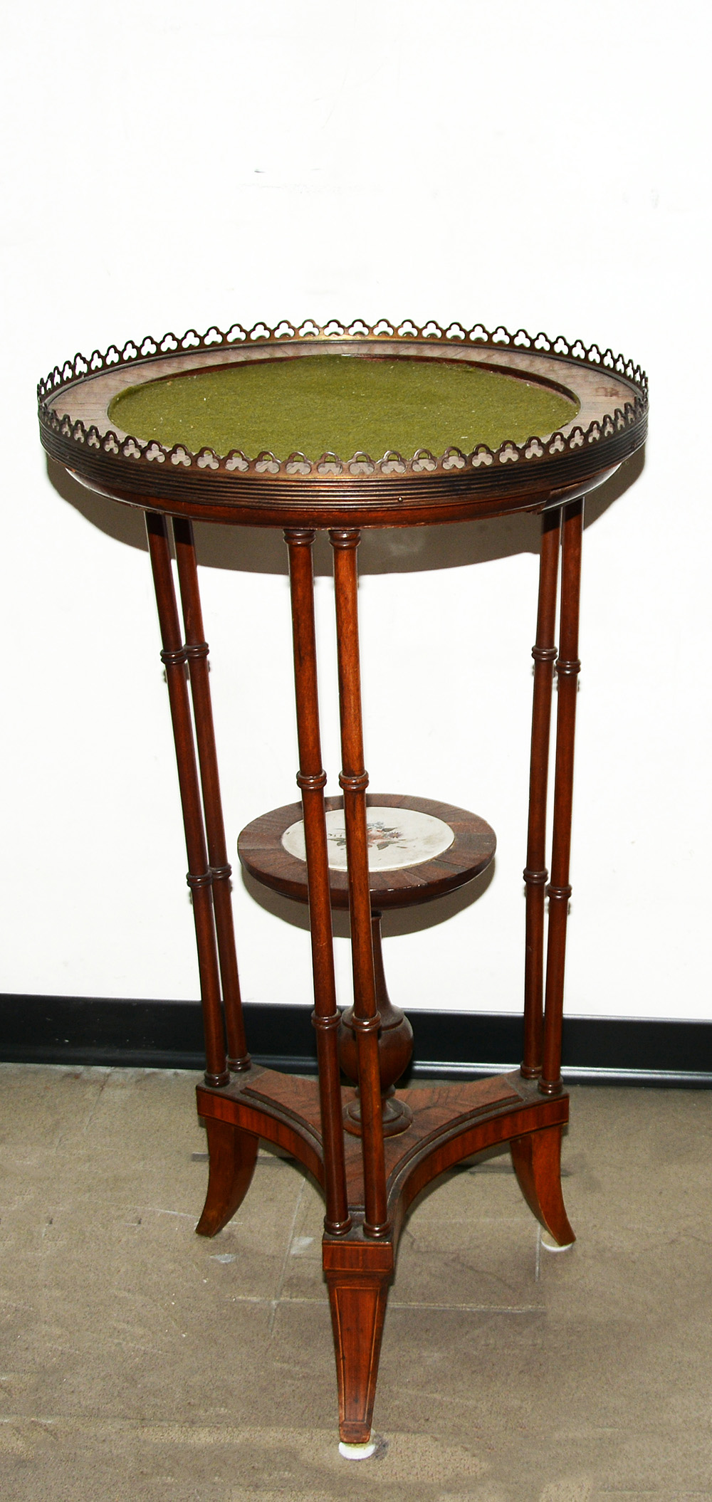 Gueridon tripode con piano superiore decorato a ringhierina, sottopiano decorato con inserto in ceramica (cm h 72) (difetti e rotture)