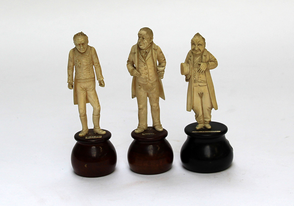 Arte inglese, secolo XIX. Gruppo di tre sculture in avorio di personaggi tratti dalle novelle di Charles Dickens (h. cm 11) Poggianti su basi in legno tornito (difetti)