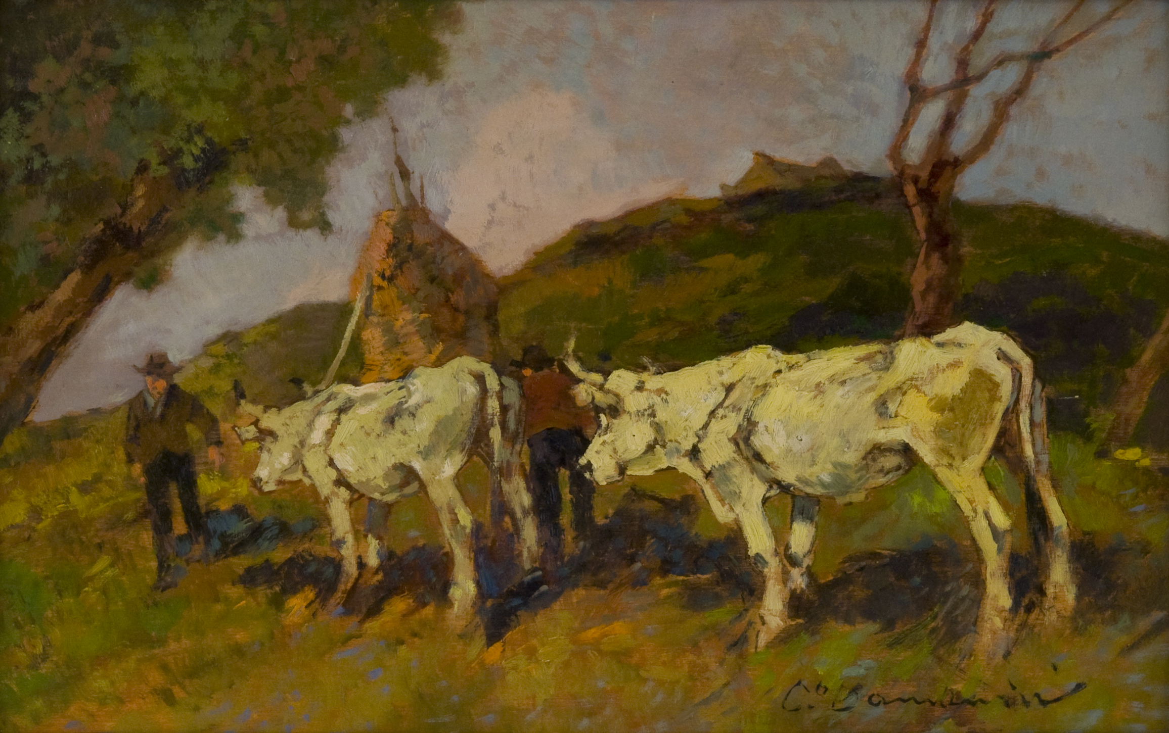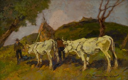Carlo Domenici Le mucche bianche Olio su tavola, cm. 35x55 Firmato in basso a...