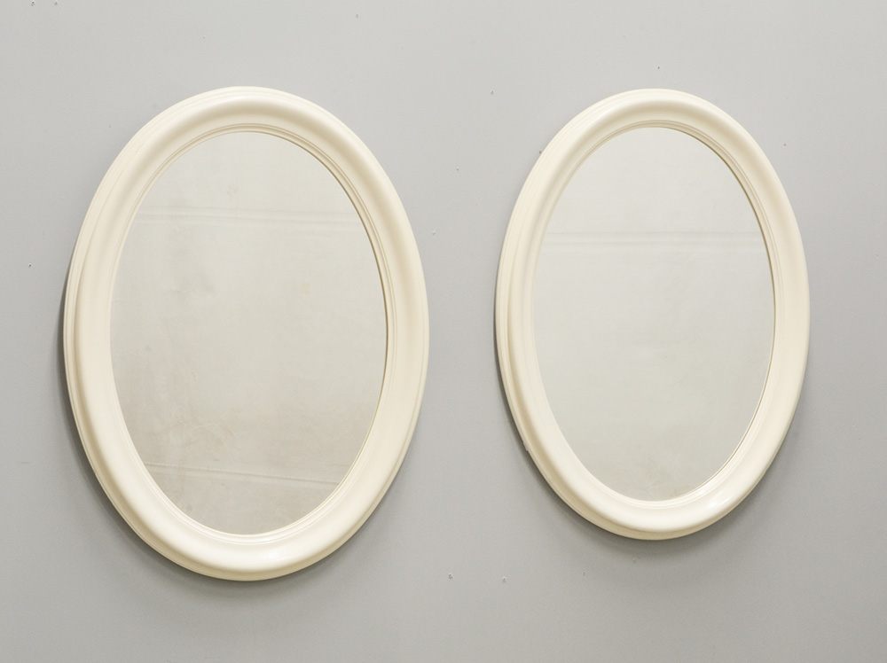 Coppia di specchiere ovali con cornici laccate bianche (cm 80x63) (difetti)