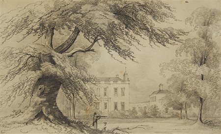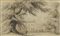 Artista del secolo XIX "Paesaggio con cacciatore" matita su carta applicata...