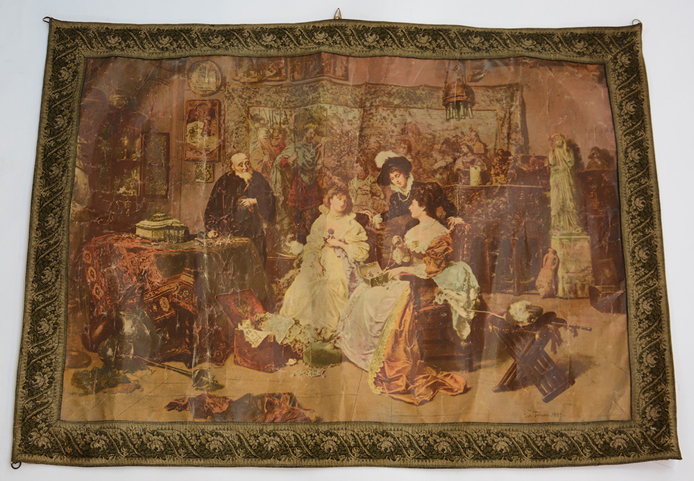 Riproduzione da un dipinto di Induno (cm 70x88) in cornice a finto arazzo (difetti).