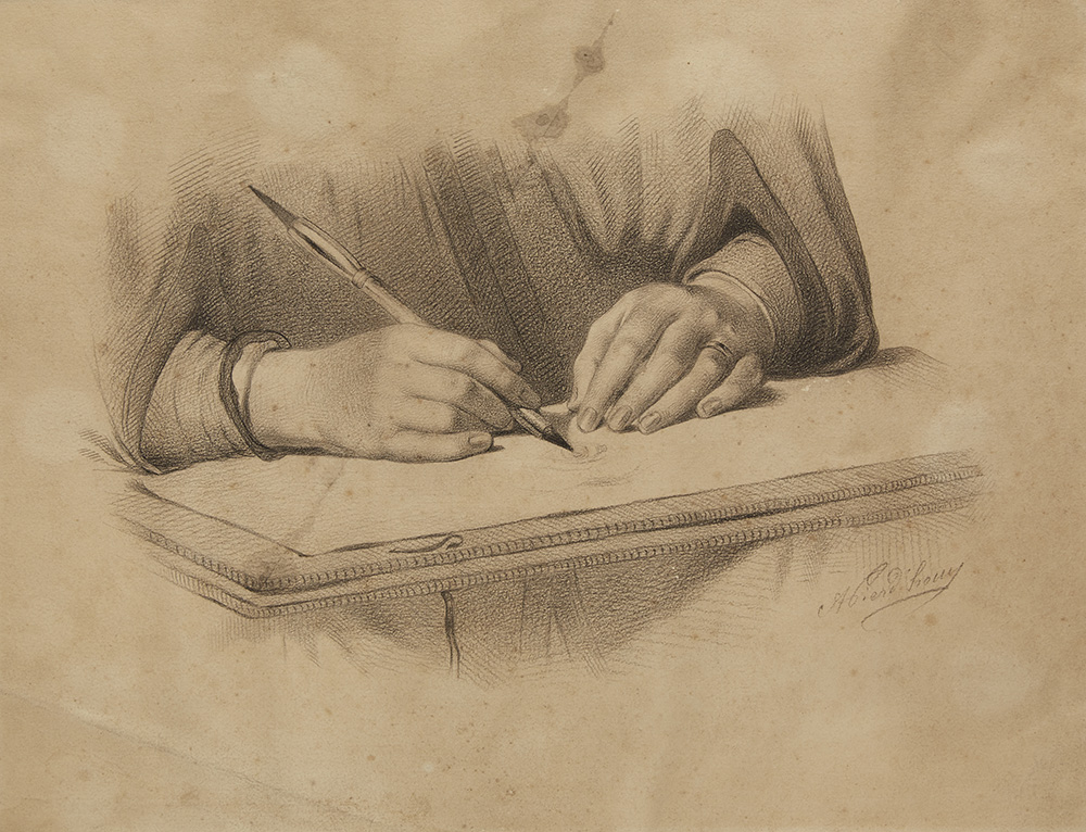 Artista del secolo XIX "Mani che disegnano" matita nera su carta applicata su...