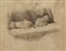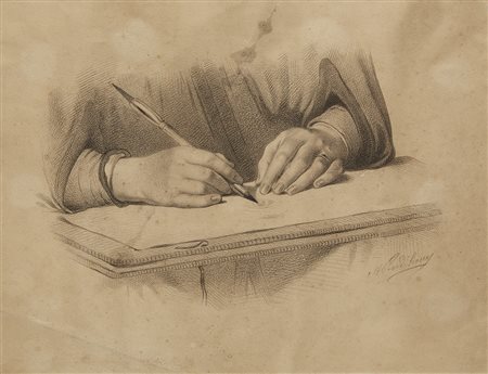 Artista del secolo XIX "Mani che disegnano" matita nera su carta applicata su un supporto in cartoncino (mm 320x417)