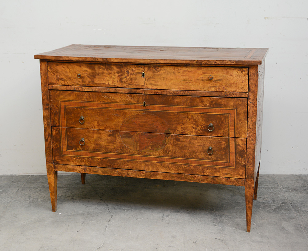 Comò a tre cassetti filettato e decorato con intarsi figurativi (cm 118x91x63) (difetti e restauri)