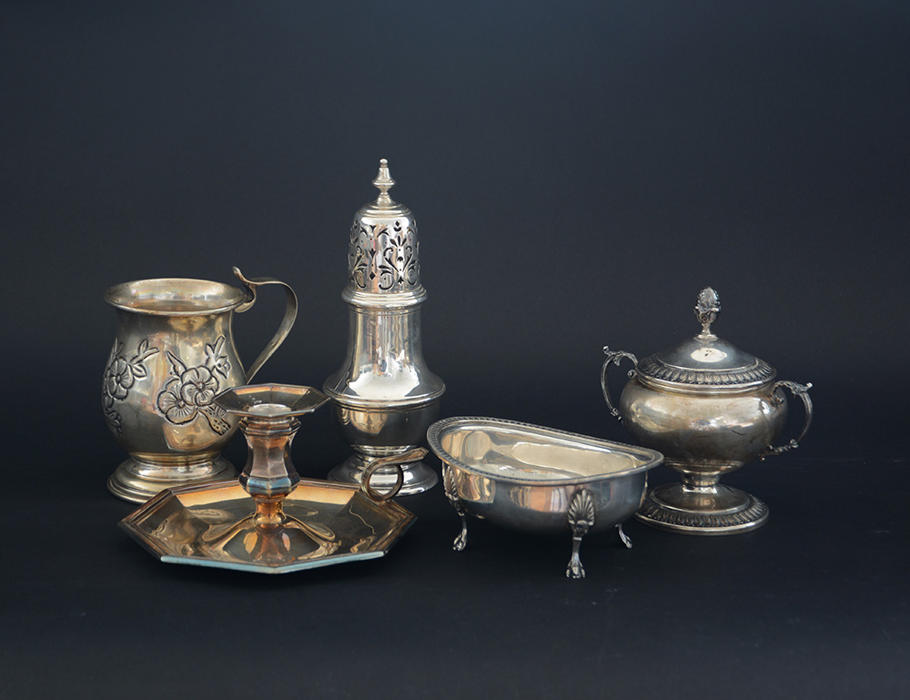 Lotto in argento composto da bugia, boccale, zuccheriera, ciotola, caster...