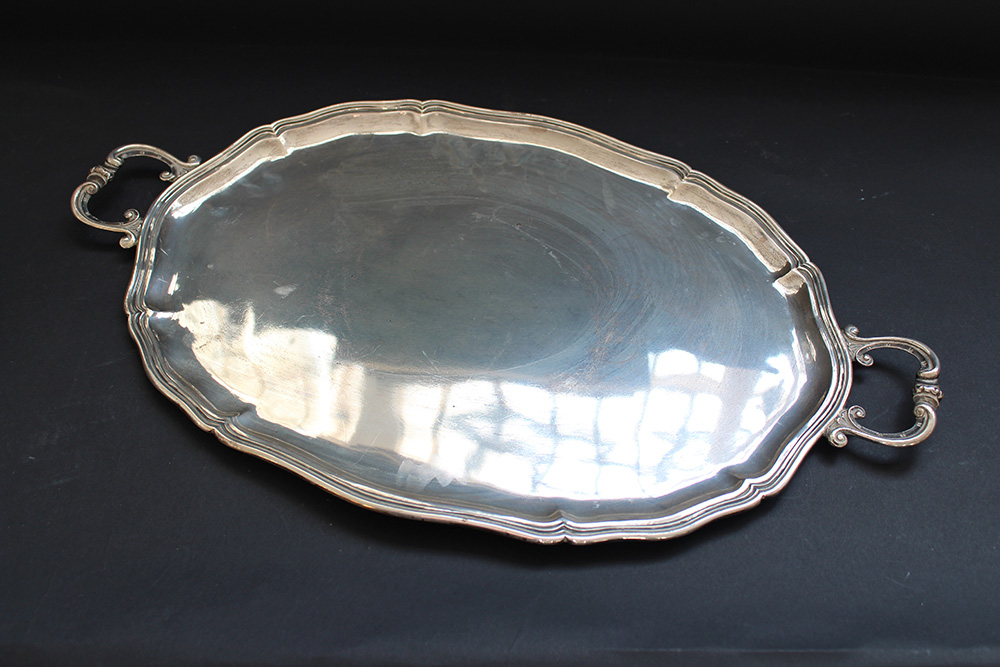 Vassoio biansato in agento con bordo scanalati e asse decorato a ricciolo (g 1200 ca.)