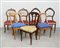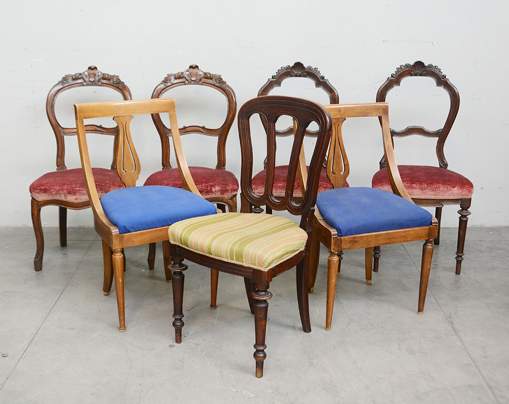 Lotto di sette sedie con schienali a giorno di differenti fatture (difetti)