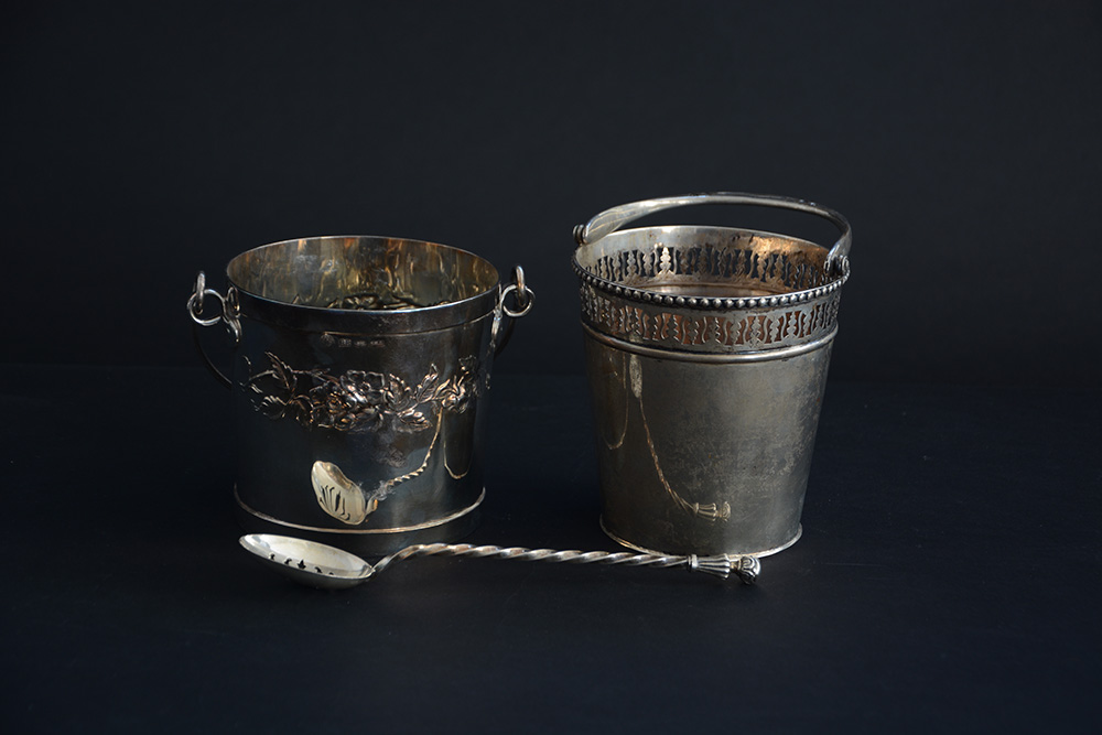 Due secchielli portaghiaccio con cucchiaio (g 930 ca.)(lievi difetti)