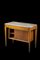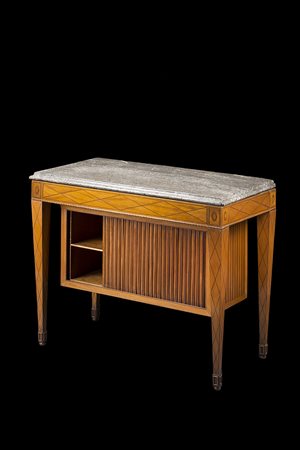 Tavolo lastronato in legno di frutto e decorato a motivi geomerici e rosoni in legni vari. Vano sottopiano con anta scorrevole a saracinesca. Gambe rastremate terminanti con scarpette in legno. Piano in marmo lumachella. Toscana, secolo XIX (cm 114,5x91x57,5) (difetti)