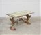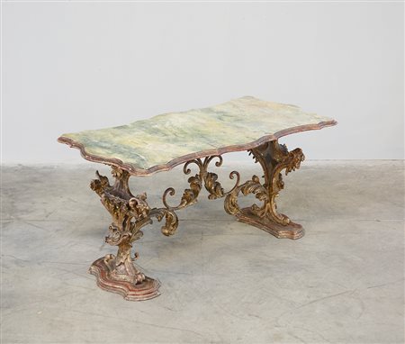 Tavolino da salotto con sostegni e traverse in legno intagliato a volute e ferro battuto, piano sagomato dipinto a finto marmo (cm 106x53x55) (difetti)