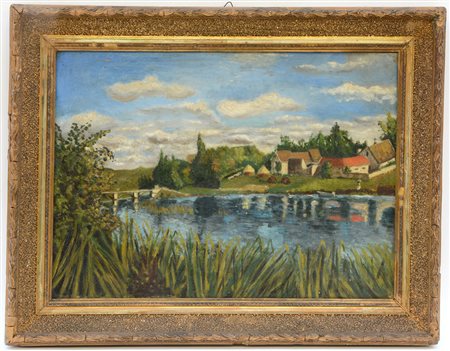 Ignoto, "Paesaggio lacustre", olio su tela (cm 33x46), in cornice (difetti alla cornice)