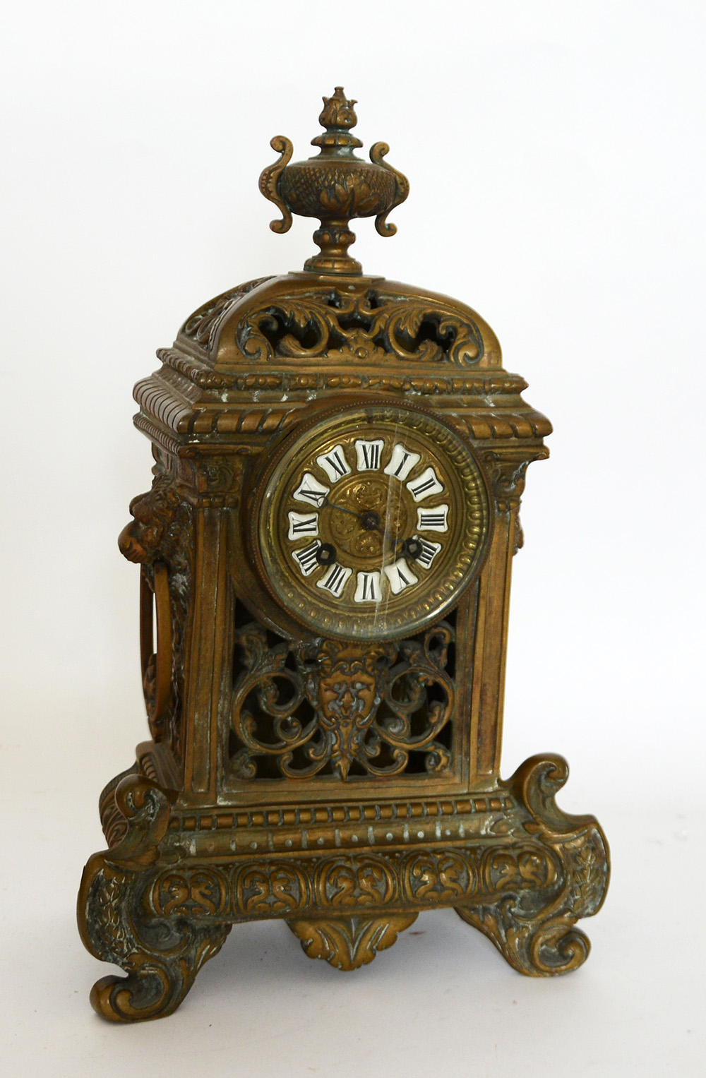 Orologio in bronzo decorato a racemi e volute, quadrante smaltato con numeri...