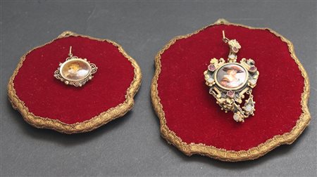 Lotto di due piccole miniature raffiguranti ritratti su supporto in velluto...