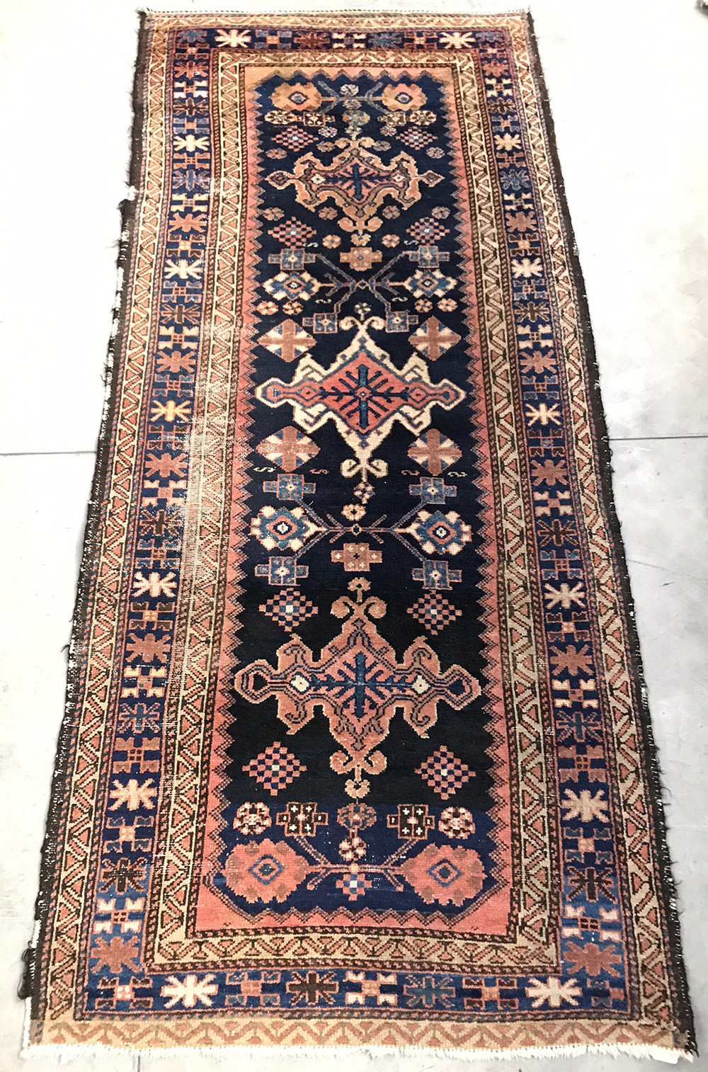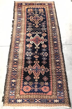 Tappeto Malayer, Persia inizio secolo XX , decoro con tre medaglioni nei toni del rosa e azzurro su campo blu notte. (cm 271x120) (difetti)