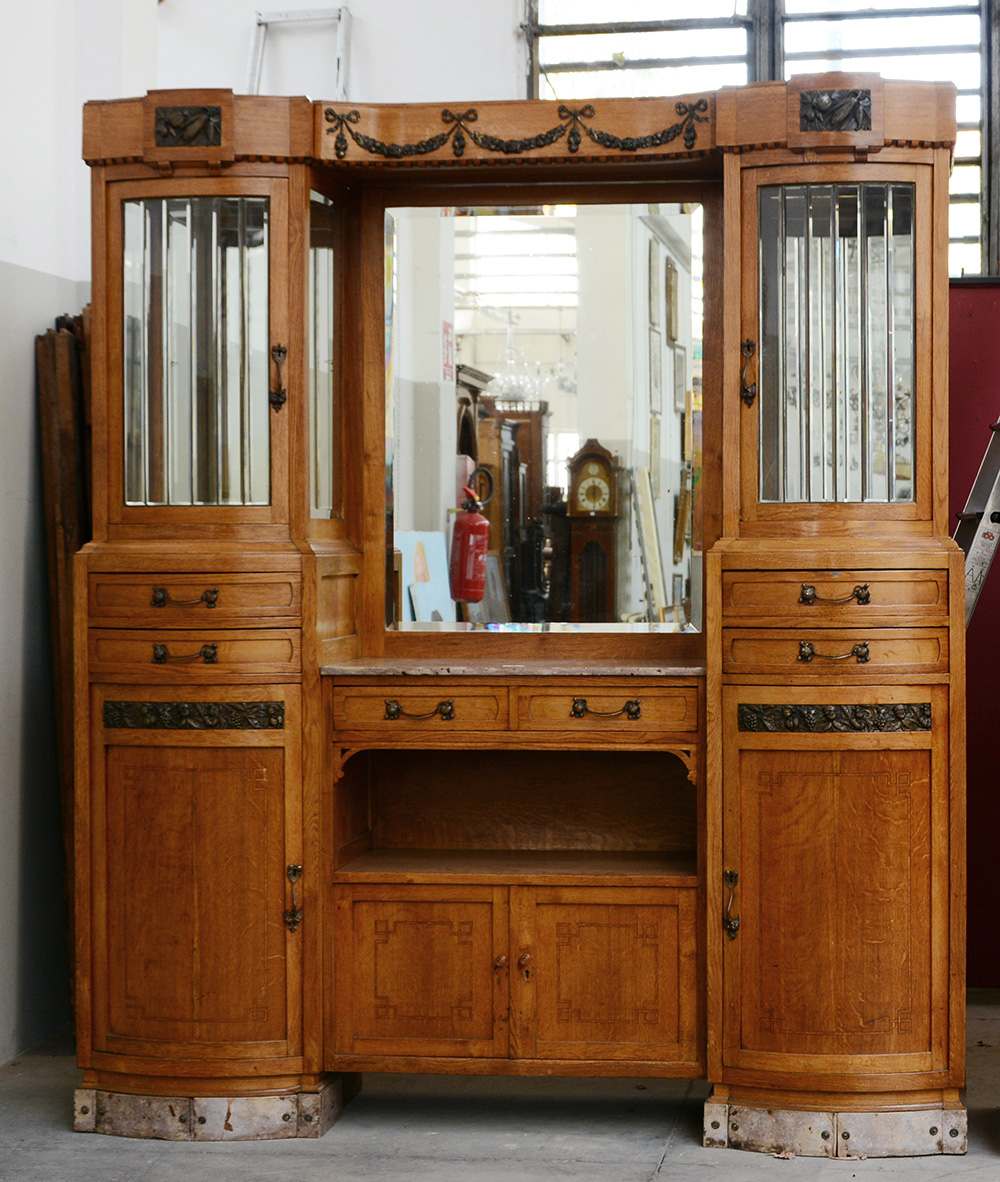 Credenza Liberty a due corpi in legno lastronato e filettato, parte superiore a due ante a vetri, specchio centrale e quattro cassetti, parte inferiore a quattro ante, cassetto, vano e pianetto in marmo, decorata da placche e fregi in metallo, inizio secolo XX (cm 200x236x58)(difetti)
