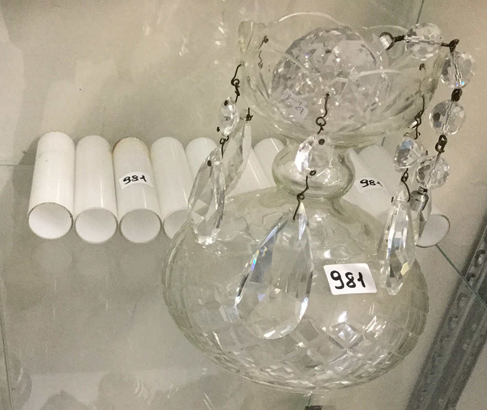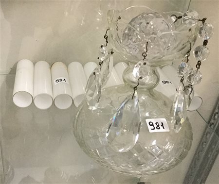 Manifattura di Boemia, lampadario a dieci luci in vetro con pendagli in cristallo sfaccettato (d cm 70, h cm 122) (lievi difetti e mancanze)