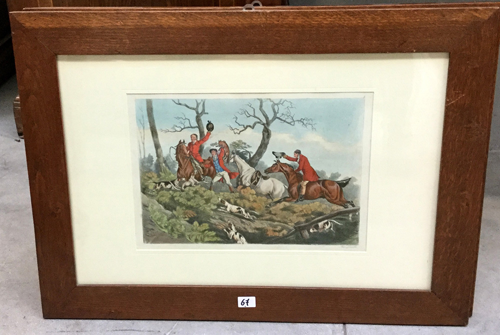 Coppia di incisioni inglesi a colori raffiguranti momenti di battute di...