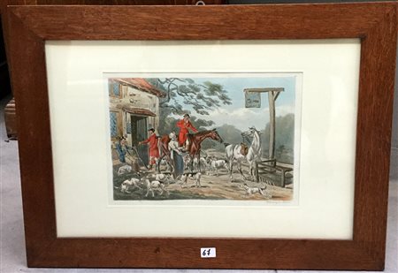 Coppia di incisioni inglesi a colori raffiguranti momenti di battute di caccia (cm 36x54) in cornice