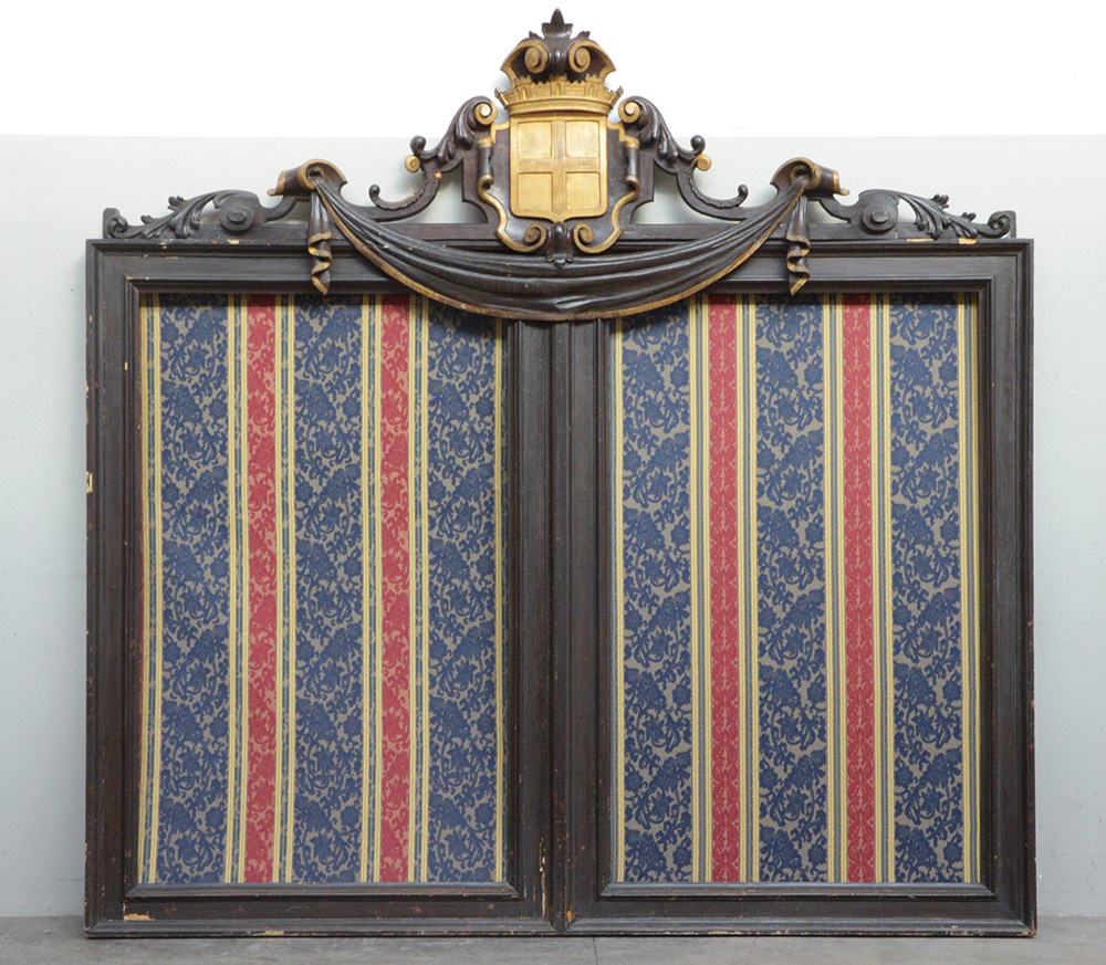 Cornice doppia a cassetta in legno laccato con cimasa decorata da fregio in legno scolpito a stemma nobiliare coronato e festoni e parzialmente dorato (cm 240x250)(difetti)