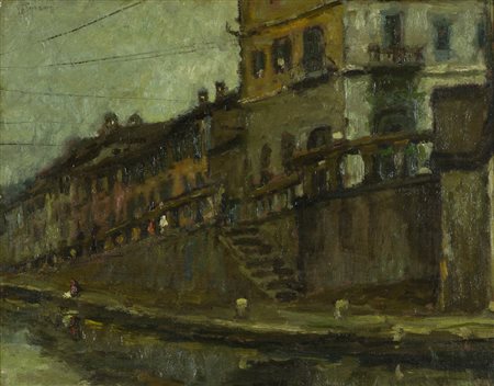 Giovan Franceso Gonzaga Naviglio alla ripa, 1950 Olio su cartone telato, cm. 40x50 Firmato in alto a sinistra. Sul verso: firma, data e titolo; Timbro "Archivio Fotografico Generale Giovan Francesco Gonzaga, con n° AAP35N36". Autentica dell'Archivio Fotografico Generale Giovan Francesco Gonzaga, a cura della Galleria d'Arte Il Salotto, Milano, su foto, con Archivio n° AAP35N36.