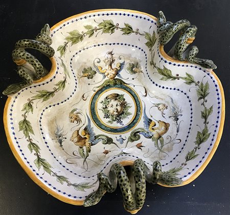 Alzatina in terracotta decorata a grottesche in policromia con anse a serpente. Firmata Ginori sotto la base. (h cm 16; d cm 27) (Lievi difetti e restauri)