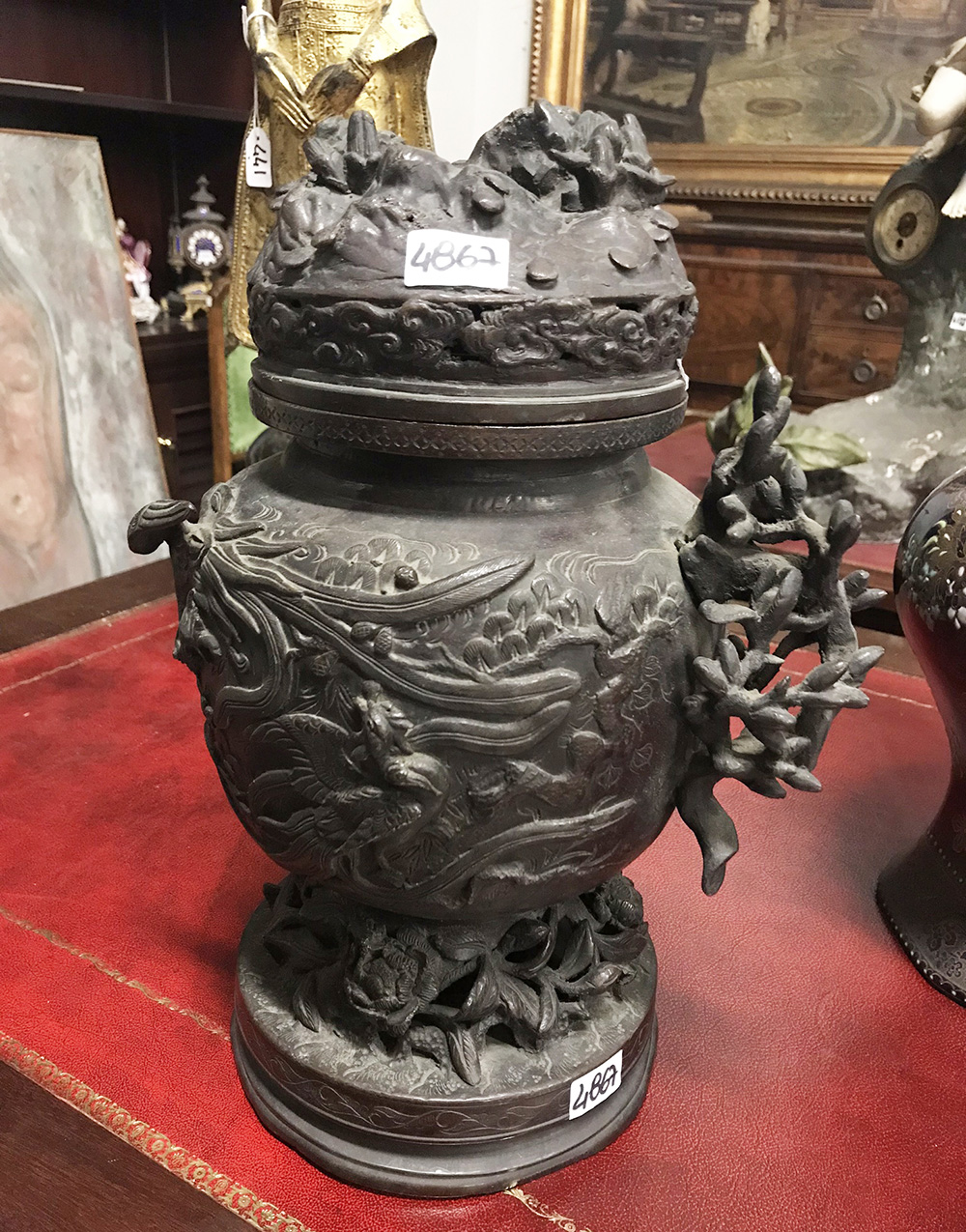 Incensiere in bronzo, composto in tre sezioni, con decorazione a rilievo, Giappone, periodo Meiji (1860-1912)(h cm 37)(difetti e mancanze)