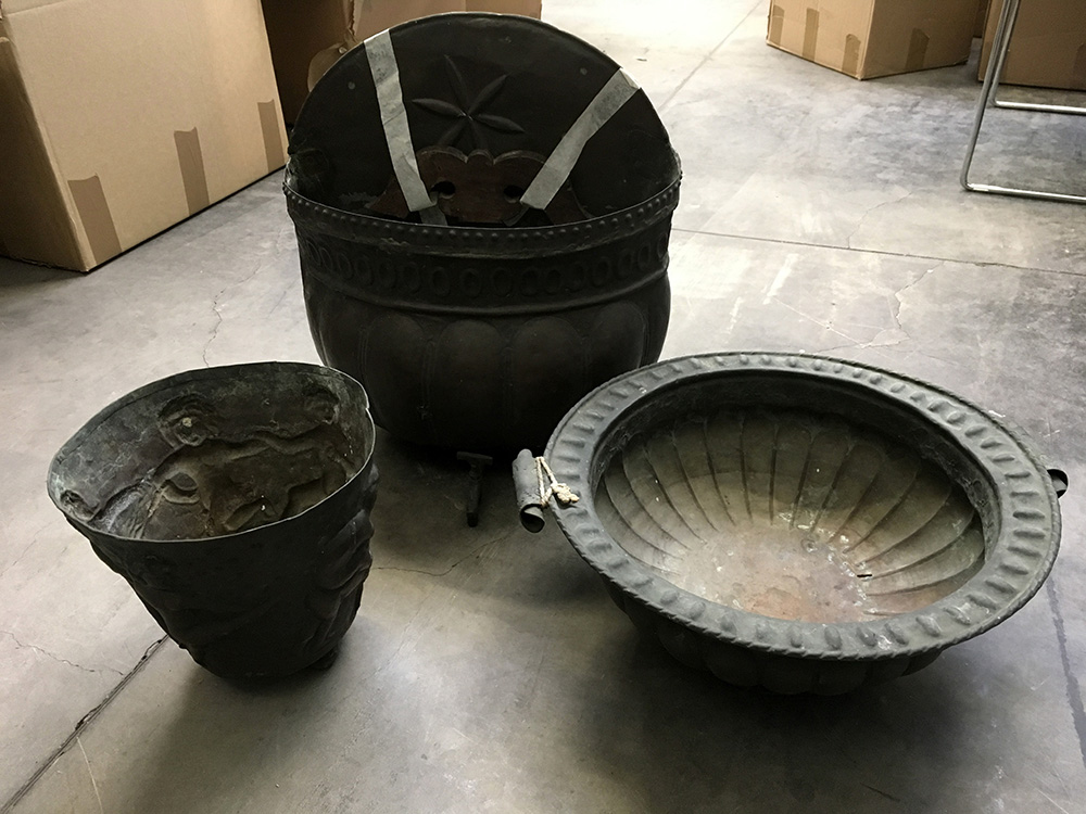 Lotto composto da tre contenitori in rame di forme, decori e misure diverse (difetti)