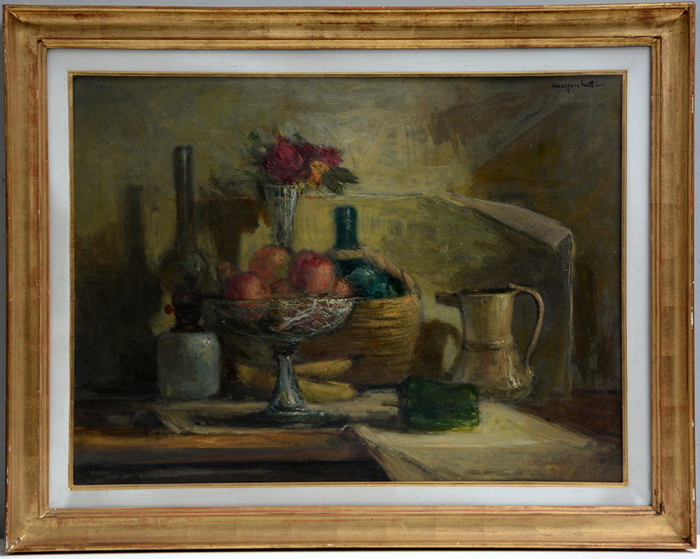 "Natura morta con fondo chiaro" olio su tela (cm 60x80) firmato in alto a destra. Firmato e titolato al retro , in cornice (difetti)