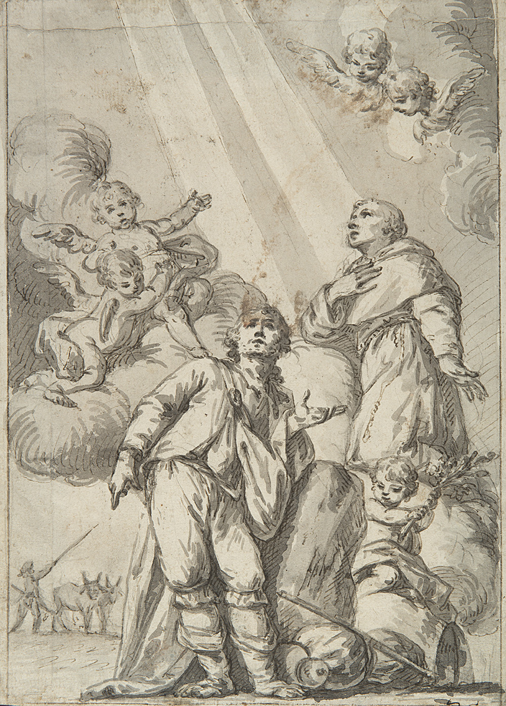 Artista del secolo XVIIISanti con angeliPenna e inchiostro bruno acquerellato...