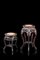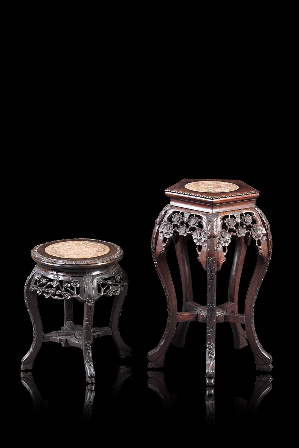 Due tavolini in legno intagliato a motivi vegetali e piano in pietra dura...