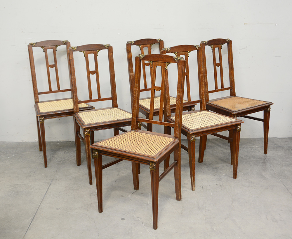 Gruppo di sei sedie con sedute in paglia di Vienna, schienali a giorno con guarnizioni applicate in bronzo a forma di foglie e ghiande. Inizio secolo XX (difetti)