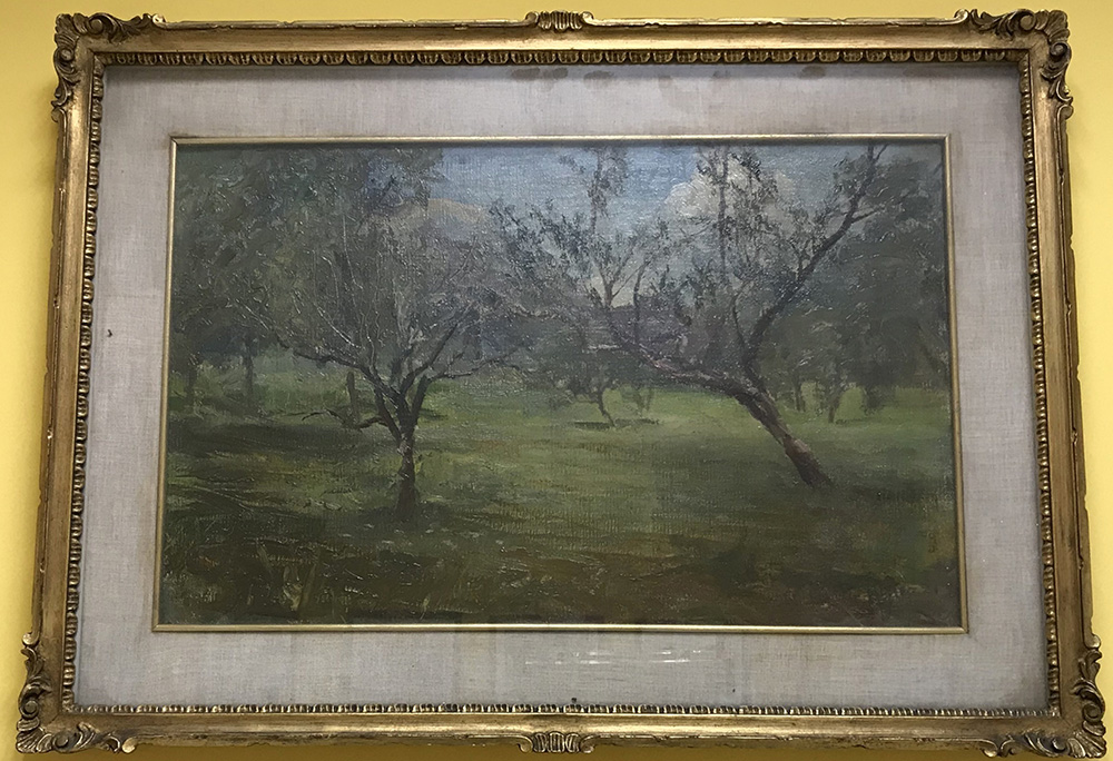 "Alberi" olio su tela applicato a tavola (cm 30x51) Firmato in basso a destra. In cornice