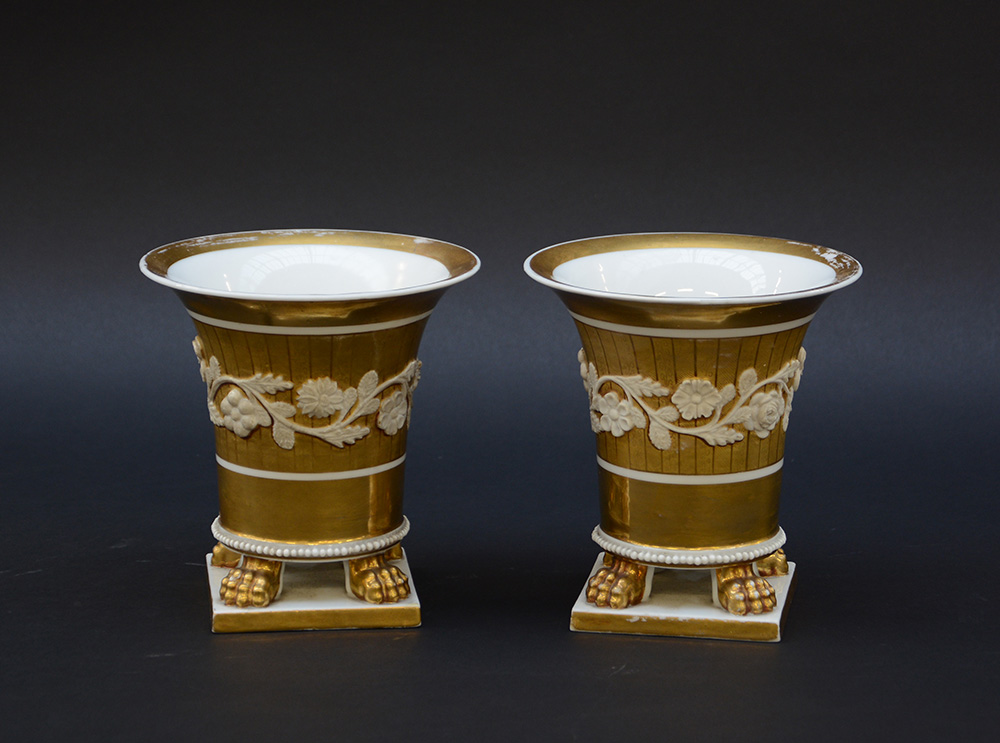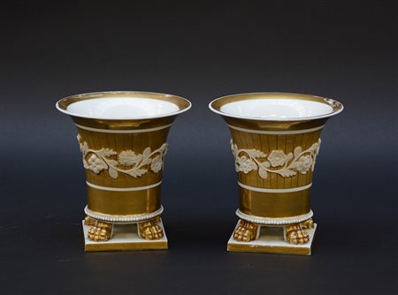 Coppia di vasetti in porcellana dorata retti da piedi ferini con fascia decorata da rami fioriti in rilievo, secolo XIX (h cm 13,5) (difetti)