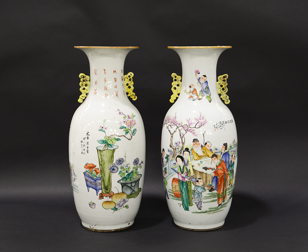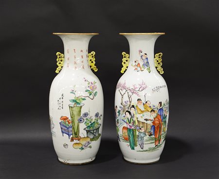 Coppia di vasi biansati in porcellana decorati in policromia a scene di vita e iscrizioni (h cm 60) (difetti)