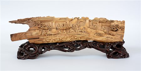 Scultura in avorio fossile con figure in padiglioni, firmato, base in legno...