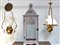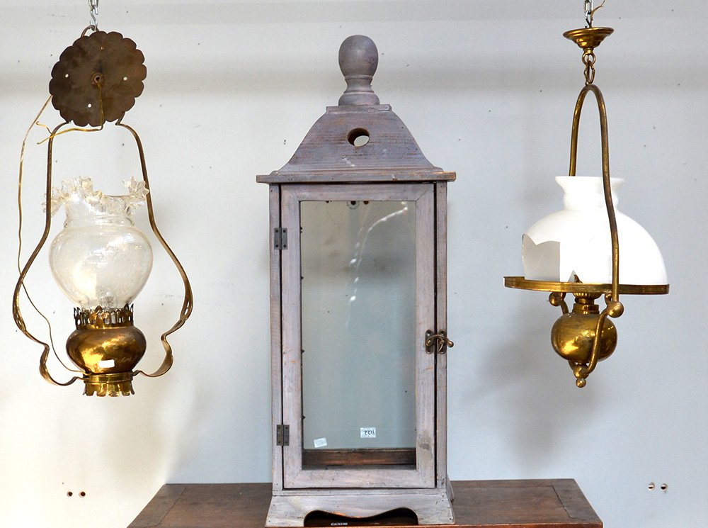 Lotto composto da una lanterna in legno e due lampadarietti in ottone e vetro (difetti e mancanze)