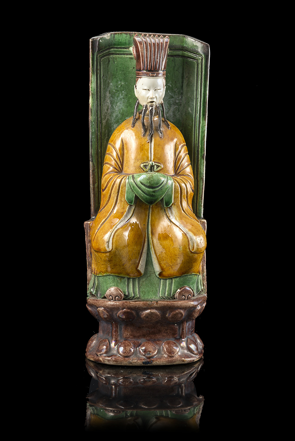 A biscuit model of an official with sancai glaze (restorations)