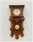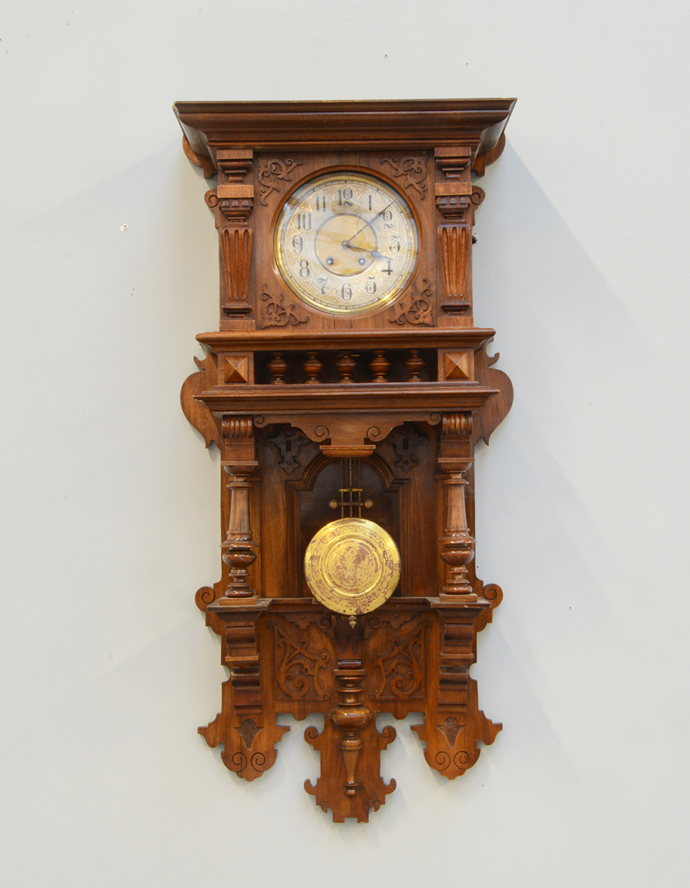 Orologio a muro con cassa in legno di forma architettonica. Quadrante a fascia in metallo con numeri arabi, movimento con carica settimanalesuoneria delle ore e delle mezze su gong. Secolo XX