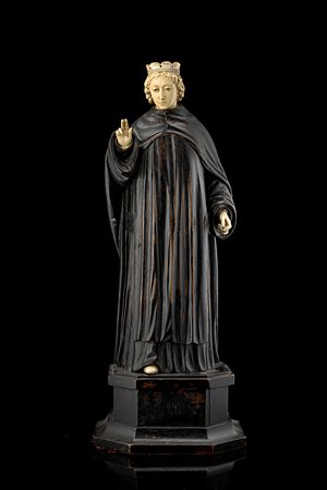 Arte francese, secolo XIX . Probabilmente figura di Giovanna D'Arco, statuetta in legno con testa e mani in avorio (h. cm 34) poggiante su base ottagonale (difetti)