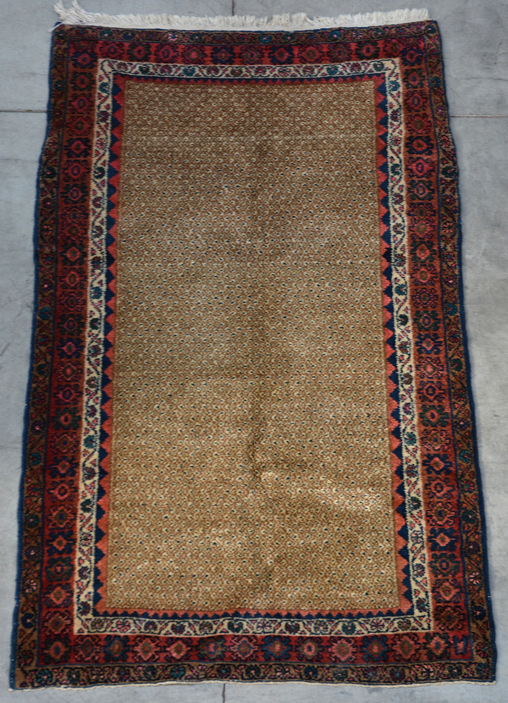 Tappeto Hamadan, Persia, inizio secoloXX. Campo decorato in lana cammello cosparso di piccoli semini bianchi e blu (cm 178x105) (lievi difetti)