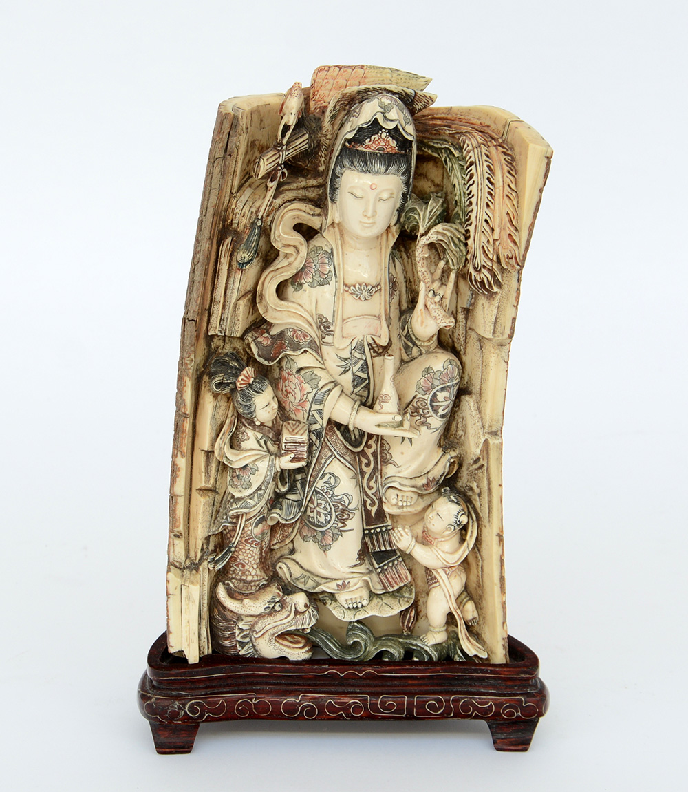 Parte di zanna in avorio con Guanyin e fanciulli con base in legno (difetti)