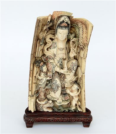 Parte di zanna in avorio con Guanyin e fanciulli con base in legno...