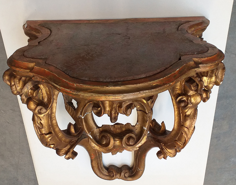 Antica console in legno intagliato e dorato di gusto rocaille, piano sagomato con inserto in tessuto (cm 59x72x43) (difetti e mancanze)