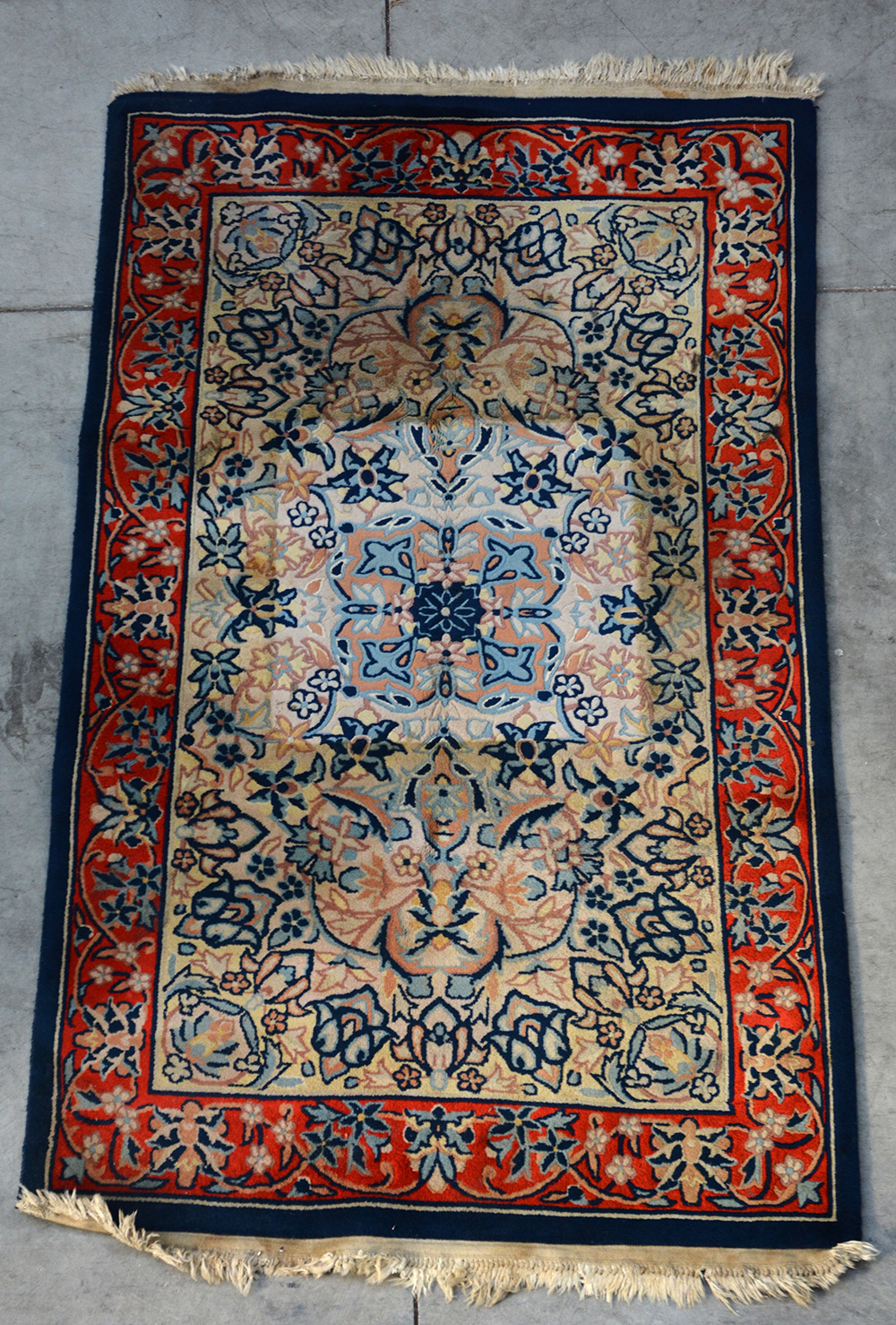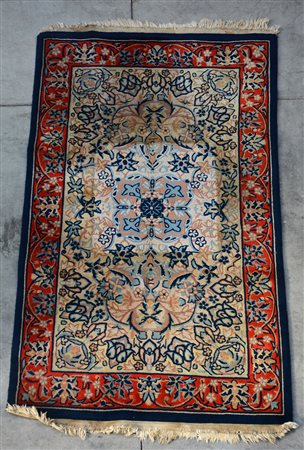 Tappeto cinese, secolo XX. Annodato con tecnica a intaglio, motivo floreale nei toni dell’azzurro e blu su fondo beige, bordura a fondo arancio (cm 160x93) (difetti)