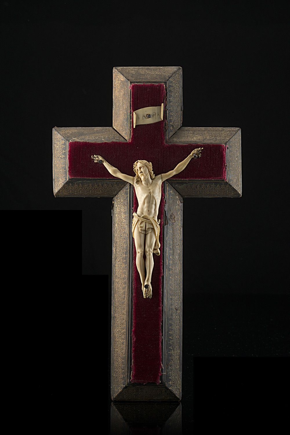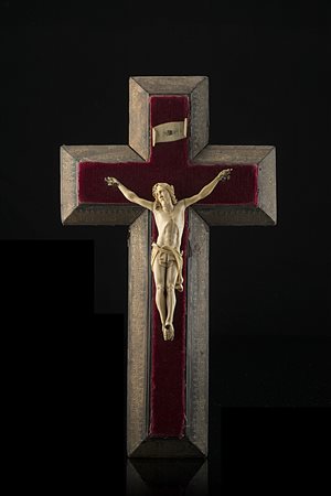 Arte del secolo XIX. Cristo in avorio montato su croce in velluto e marocchino impresso in oro (h. cm 16) (lievi mancanze)