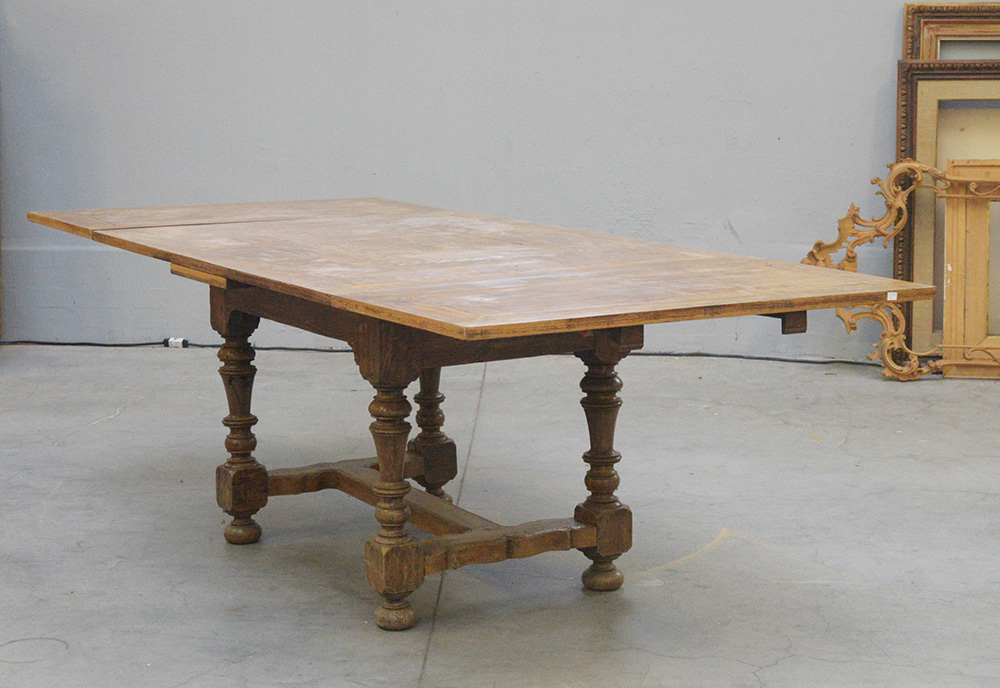 Tavolo allungabile in rovere con montanti torniti riuniti da traversa. Secolo...