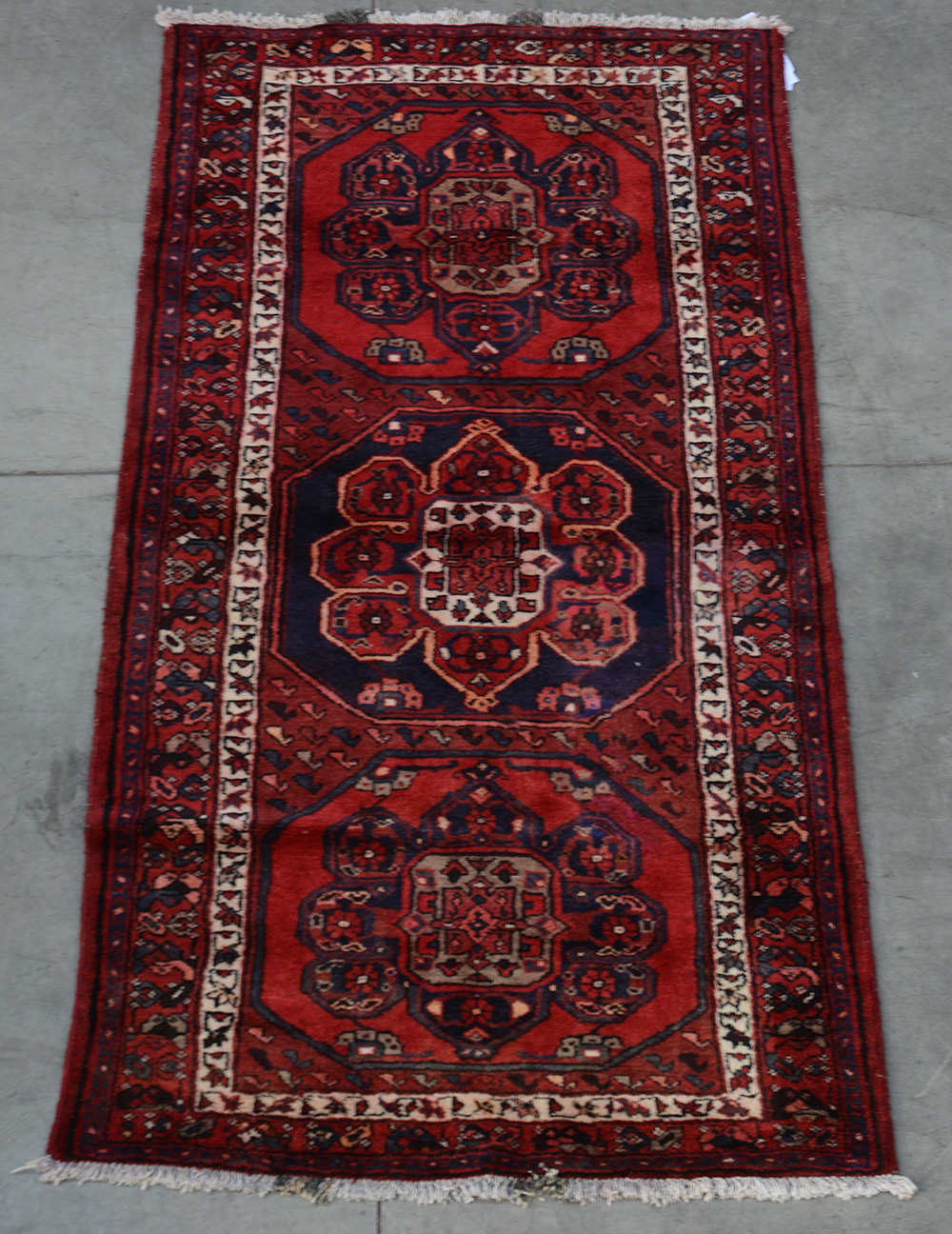 Tappeto Hamadan, Persia, secolo XX. Disegno a tre medaglioni in rosso e blu (cm 220x106) (difetti)