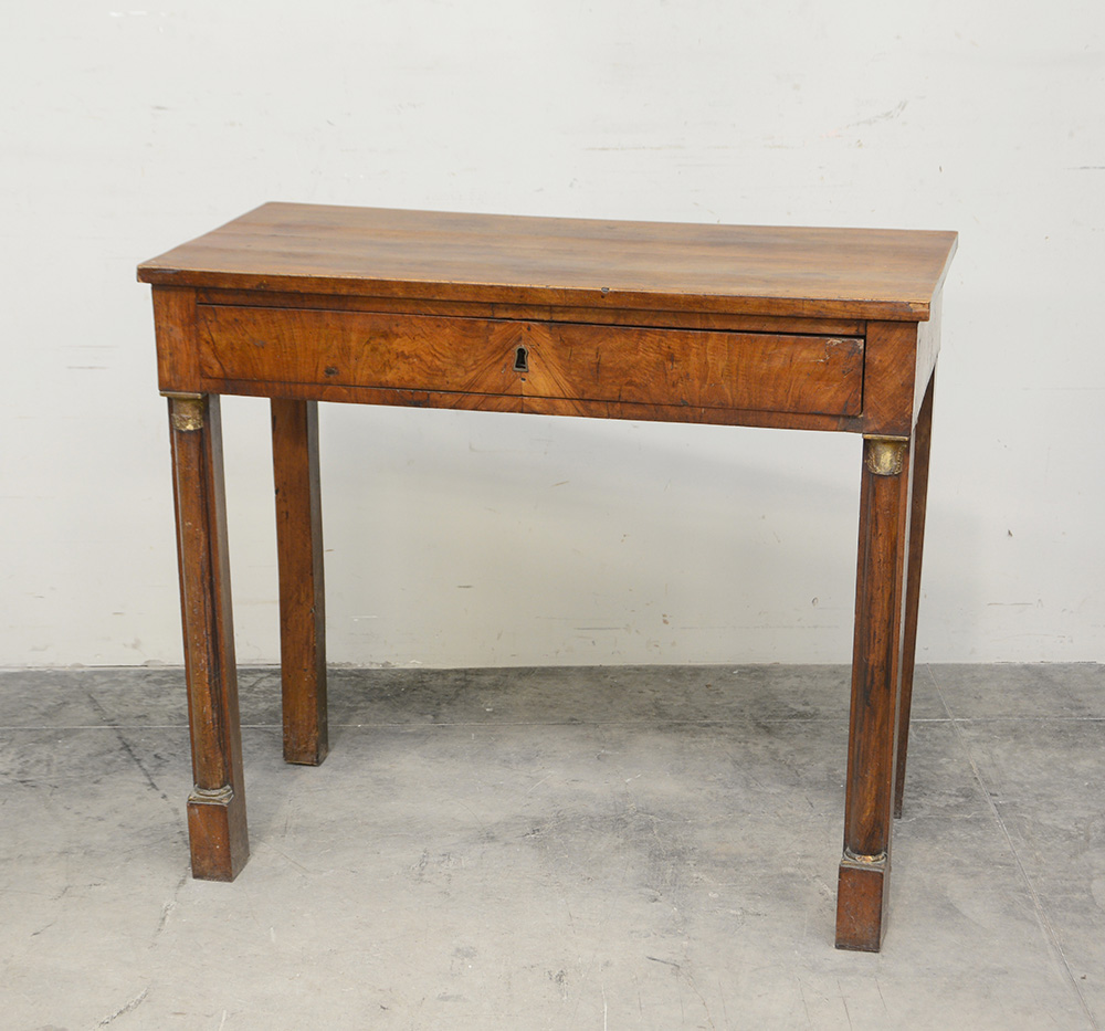 Piccolo scrittoio in noce decorato con semicolonne sulle gambe anteriori e cassetto nella fascia, secolo XIX (cm 90x77x45) (difetti)