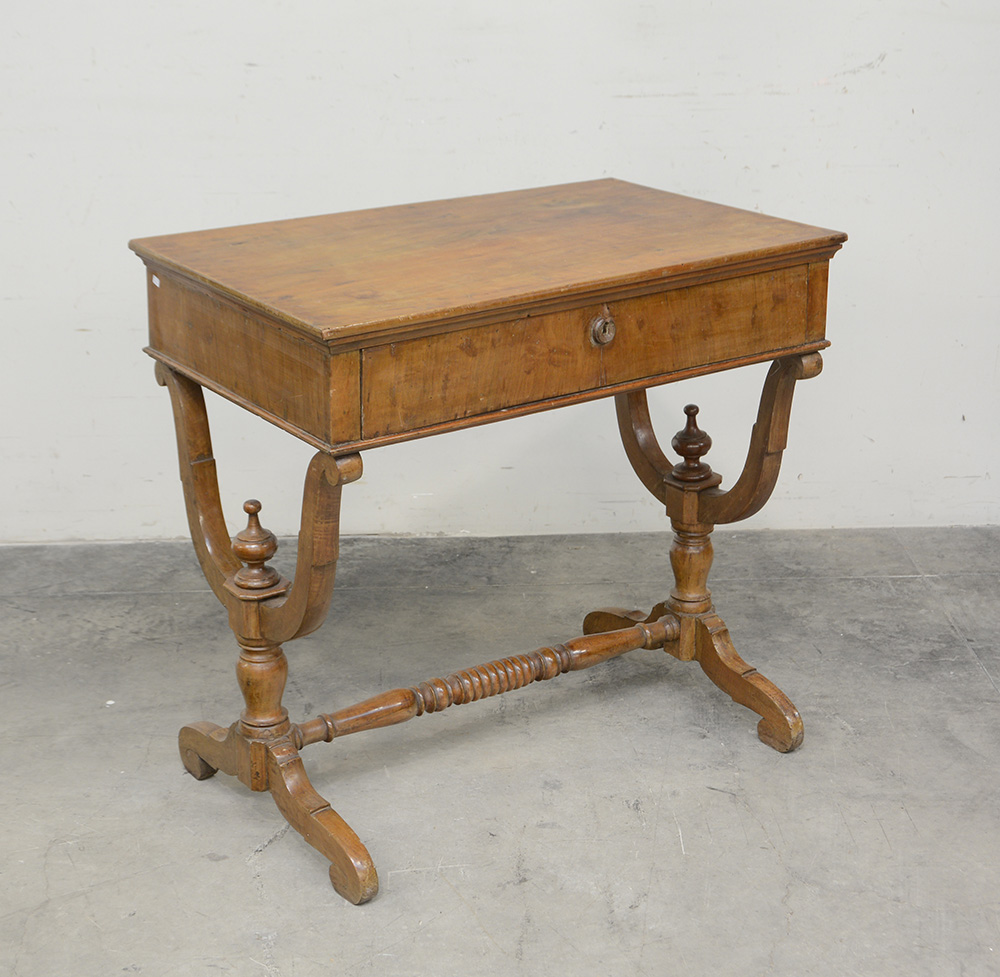 Piccolo scrittoio con sostegni mossi riuniti da traversa, cassetto nella fascia con divisori interni, secolo XIX (difetti e mancanze)
